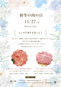 【お知らせ】11月27日(木)初冬の肉の日のご案内になります。